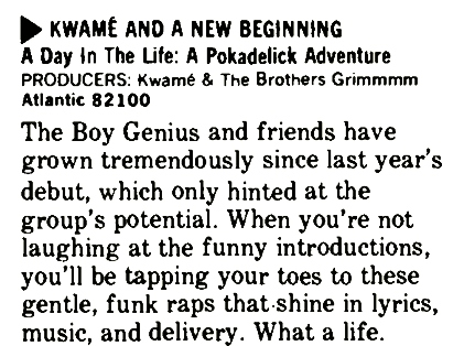 The creative rapper/writer/producer with the distinctive blonde streak in his hi-top fade had stretched his imagination even further on the concept album “A Day In The Life – A Pokadelic Adventure,” with his six-member crew, A New Beginning. “The album really takes place in two days,” explained Kwamé at the time, whose father was a jazz musician who hung out with the likes of Abdullah Ibrahim and Sun Ra. “It takes place in the past, the present and the future all at the same time.”