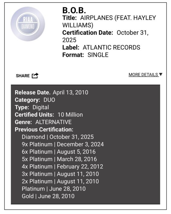 “Airplanes changed everything for me,” states B.o.B. “To see it go Diamond in the same year we’re celebrating 15 years of The Adventures of Bobby Ray feels full circle. I’m grateful to Hayley, to the fans, and to everyone who’s been on this journey from the start.”
