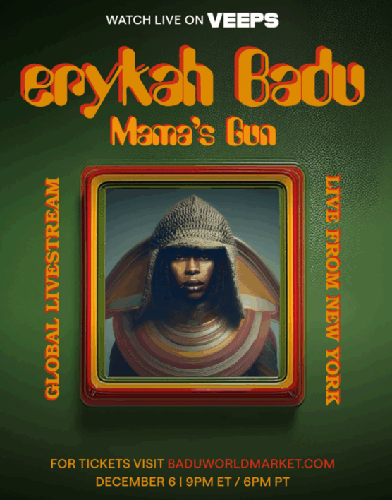 VEEPS will present Erykah Badu: Mama’s Gun | Live from King’s Theater on Saturday, December 6 at 9:00 PM ET.