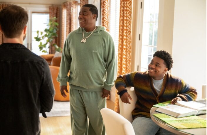 (THE FALL AND RISE OF REGGIE DINKINS — “Pilot” Episode 101 — Pictured: (l-r) Tracy Morgan as Reggie Dinkins, Jalyn Hall as Carmelo Photo by: Scott Gries/NBC)